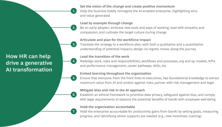 Because generative AI and other AI tools will affect nearly every part of an organization, HR must take a central role in implementation. This means more than just identifying and attracting the right AI talent—it means helping set the vision for the entire company, leading by example through GenAI adoption, building learning and development capabilities through reskilling and upskilling programs, and ensuring that all AI systems are used in an ethical way that enhances employee well-being.