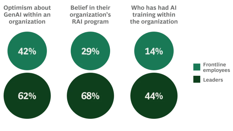 Even so, there are vast differences in perceptions of AI between leaders at the top and employees on the frontline. Leaders are much more optimistic than frontline employees about GenAI (62% vs. 42%), for example. They’re also much more likely to be familiar with the technology: 44% of leaders say that they have received training on AI tools, while only 14% of front-line employees say that they have received similar training. And while 68% of leaders believe that their organization has an adequate responsible AI program in place, only 29% of frontline employees feel the same way.