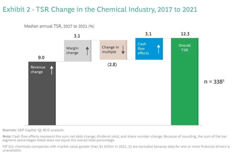The five-year period from 2017 through 2021 was turbulent in many respects, but it was a stable time for chemical companies. They enjoyed steadily increasing growth in total shareholder return (TSR) and in other fundamental economic measures. Even during two years of global pandemic, the chemical industry’s value growth held steady, and it was one of the first major industry sectors to recover financially.