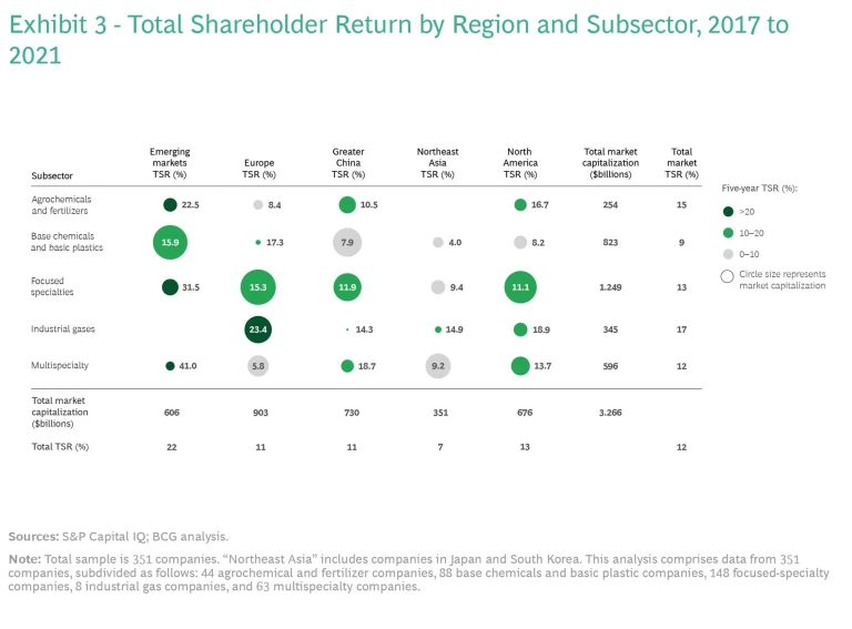India, where companies have benefited from a high level of investor confidence, has seen a consistent rise in TSR from 2017 to 2021. Some countries that used to rely on Chinese chemical imports are shifting to India as a preferred supplier nation.