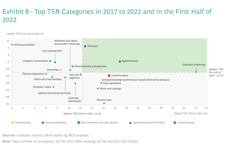 One way to explore this question is to break companies out by product category. (See Exhibit 8.) Just a few of these categories fall above median rankings in both the five-year period from 2017 to 2021 and the first half of 2022. To do so, their aggregate TSR had to stay above 12.3% for the first five years, and then their six-month TSR had to stay above –12.5% for the first half of 2022. The product categories that accomplished this feat were electronic chemicals (which delivered by far the highest TSR), agrochemicals, and fertilizers.
