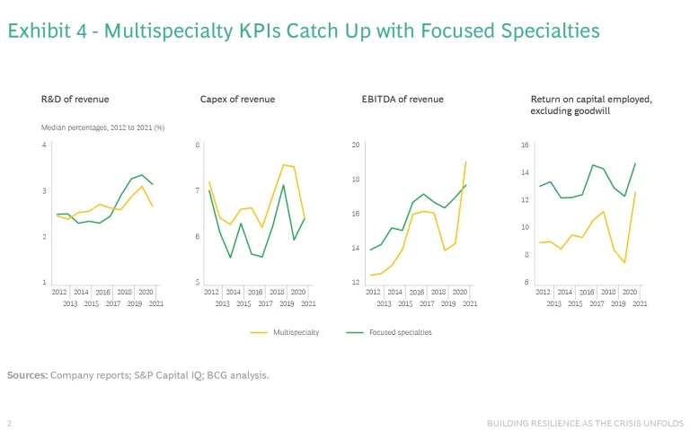 Multispecialty chemicals rose from 9% to 12%. This continues a trend that began in 2020, which we noted in last year’s report as a possible harbinger of future industry direction. These tend to be large, diversified producers, and they may be emerging from the doldrums of the 2010s. In general, the past few years have seen multispecialty companies catch up with focused specialties in several key financial metrics, most notably capex as a percentage of revenue and EBITDA as a percentage of revenue. (See Exhibit 4.) This reflects a higher ROI for the capital expenditures that multispecialty companies are making.
