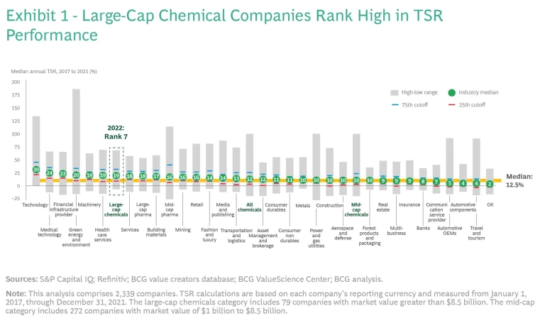 As in previous reports, we tracked the TSR status of large-cap chemical companies against that of other industries, using comparisons from BCG’s long-established Value Creators database. In the current assessment, covering 2017 through 2021, a good place to start is with large-cap chemical companies—companies whose total shareholder value exceeds $8.5 billion. There are 79 such companies in the category for this year’s report, and as a group they have done particularly well. Large-cap chemical companies ranked 7th against their large-cap peers across 33 major industries. (See Exhibit 1.) This represents a steady, significant improvement, from 16th place for the five-year period ending in 2019, to 12th for the five years ending in 2020, to their current ranking. Large-cap chemical companies also rose in absolute value, delivering an average TSR of 19% to shareholders for the five-year period ending in 2021—a significant improvement over 13% and 11% for the equivalent time frames ending in the two previous years.