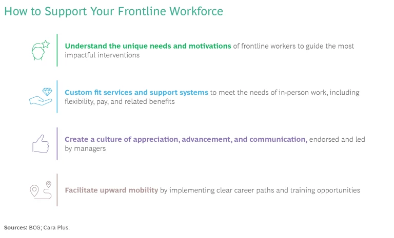 Companies can successfully address the needs and potential of frontline workers in myriad ways. These efforts deliver dividends as well: they often end up benefiting employees beyond the frontline worker population, and they create a more motivated, productive workforce that is less likely to leave and more likely to advance to management or leadership roles.