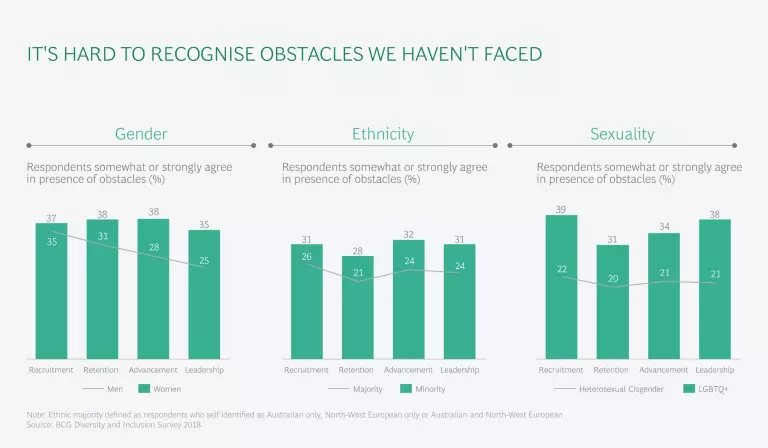 Companies in Australia invest both time and money in diversity initiatives, yet most employees in diverse groups—women, ethnically diverse individuals, and LGBTQ+ employees—say they have not benefited. A key problem: the leaders at most organisations don’t understand the real-world obstacles that diverse employees face. These companies can start making real progress once they focus on the initiatives that diverse employees themselves say are effective. New BCG analysis, based on a comprehensive worldwide survey, shows how.