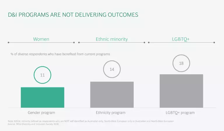In Australia and around the world, issues of gender, LGBTQ+, and cultural and ethnic diversity permeate our collective consciousness. In response, companies have launched more D&I programs and increased participation in networks like Male Champions of Change and the same-sex marriage campaign. Nearly all the employees we surveyed (97%) report that their company has at least one D&I initiative, yet these initiatives have yielded surprisingly few outcomes.