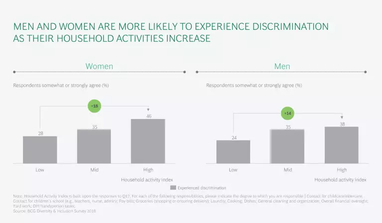 Employees at different life stages, who care for children or who have other home responsibilities, also have different experiences of discrimination and obstacles. Women and men who care for children experience discrimination at a higher rate than those who do not: 41% of women with children report having experienced discrimination compared with 34% of women without children, while 39% of men with children report having experienced discrimination compared to 27% of men without children. Employees with responsibility for household activities, regardless of their gender, sexuality, or ethnicity, are more exposed to discrimination in the workplace.