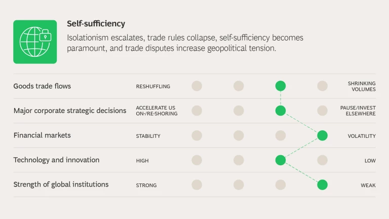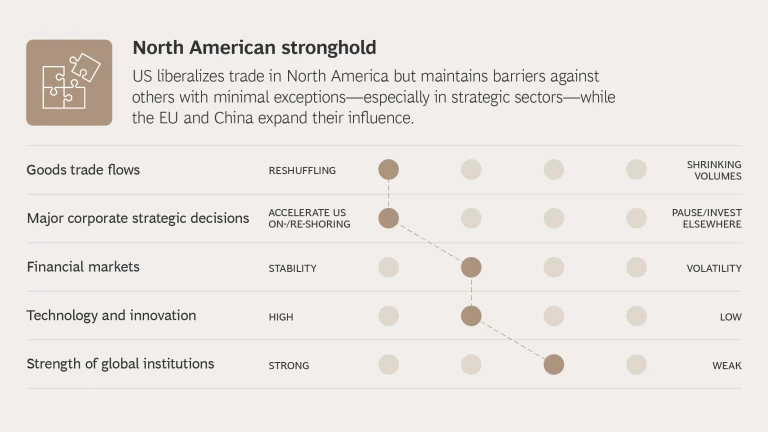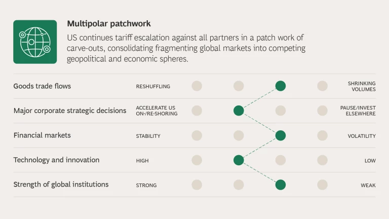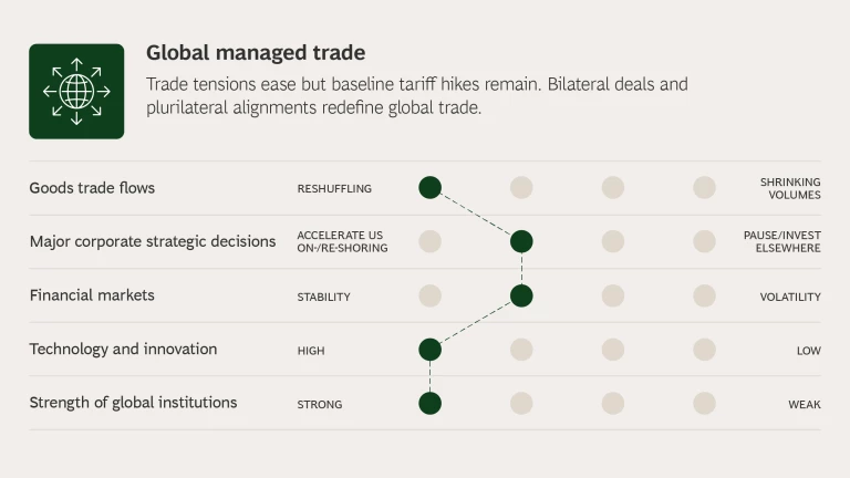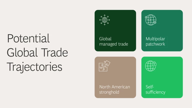 After the effects of the dramatic changes to tariff rates and other trade policies become clearer, the global business environment in 2026 and 2027 could take several different forms. To help companies prepare for an uncertain future, BCG has developed four scenarios based on potential global trade trajectories: “global managed trade,” “North American stronghold,” “multipolar escalation,” and “self-sufficiency.”