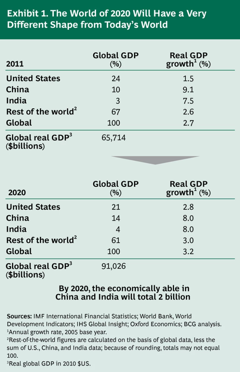 At The Boston Consulting Group, we estimate that from now through 2020, per capita income in China and India will nearly triple, and together the two countries will boast some 2 billion economically able consumers. These newly enfranchised families are building bigger houses with modern amenities and seeking apartments in high-rise towers in a growing number of densely populated cities. In both countries, people continue to want more—and better—and their lifetime consumption patterns are undergoing a radical evolution. We estimate that a child born in China in 2009 will consume on average 38 times more over his or her lifetime than one born in 1960. In India, a child who entered the world in 2009 will consume on average approximately 13 times more than one born in 1960. We’re confident that by the year 2020, consumers in the two countries will collectively spend at least $10 trillion per year.
