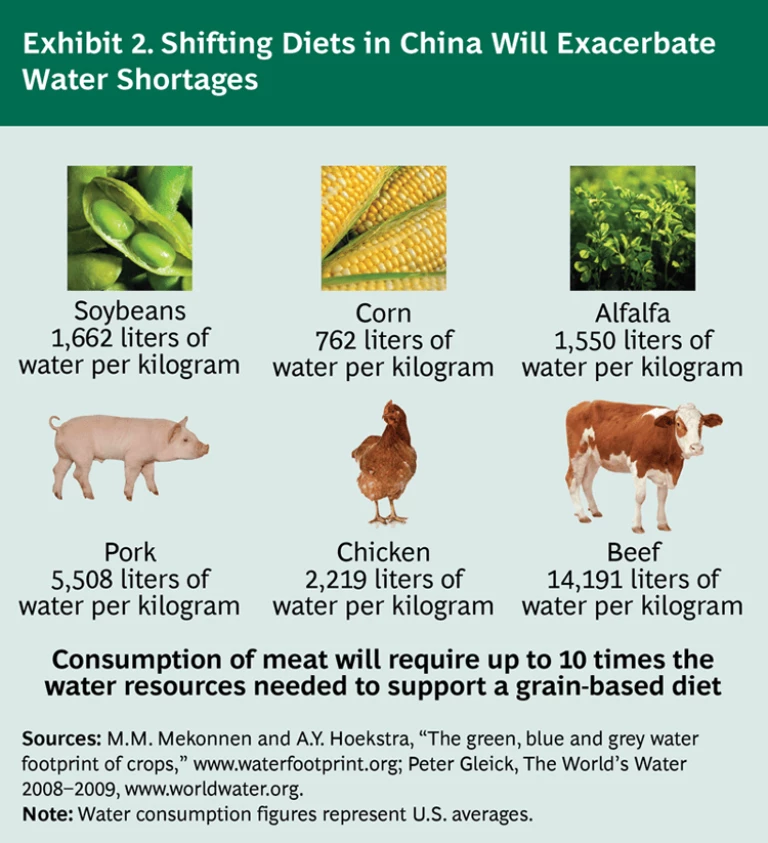 Massively higher consumption in China and India will likely trigger not only highly inflated food prices across the U.S. but also dangerous shortages of key natural resources—especially water. Climate change is already causing droughts in many regions throughout the world: In India, water shortages are acute and prevalent. In China, highly populated cities have become deserts. The droughts are leading to famine and food riots, intensified tensions between China and India, and the risk of outright war over water supply. China’s new meat-rich diet requires huge new quantities of water. (See Exhibit 2.)