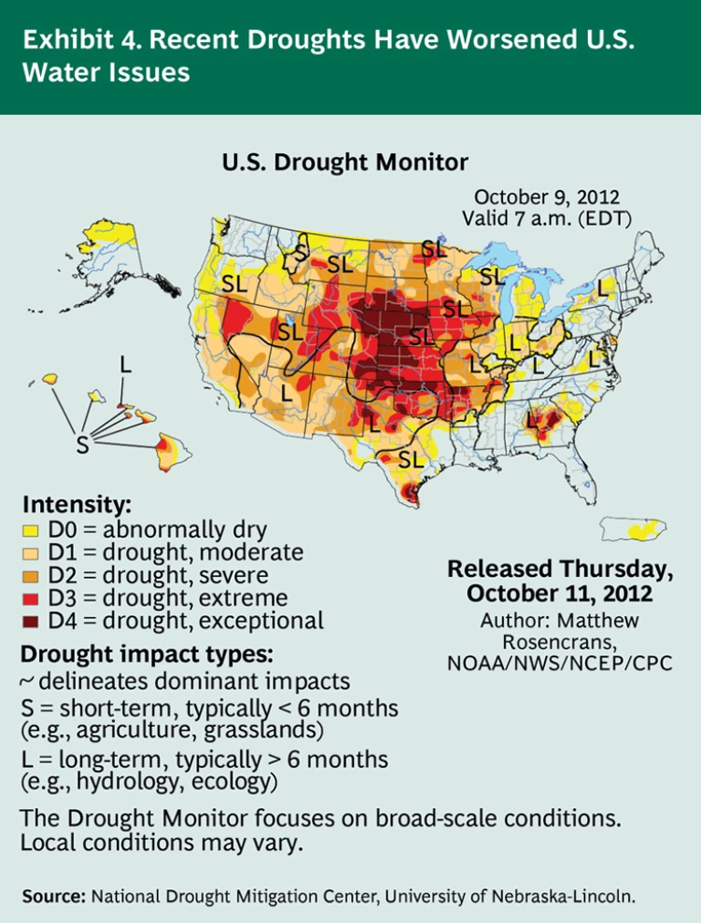 When it comes to water shortages, history offers a painful lesson. From 1931 through 1936, dustbowl conditions caused corn production in the U.S. to drop 30 percent, and prices, over the same period, soared 115 percent. Current drought conditions in the U.S. are worrisome. (See Exhibit 4.)