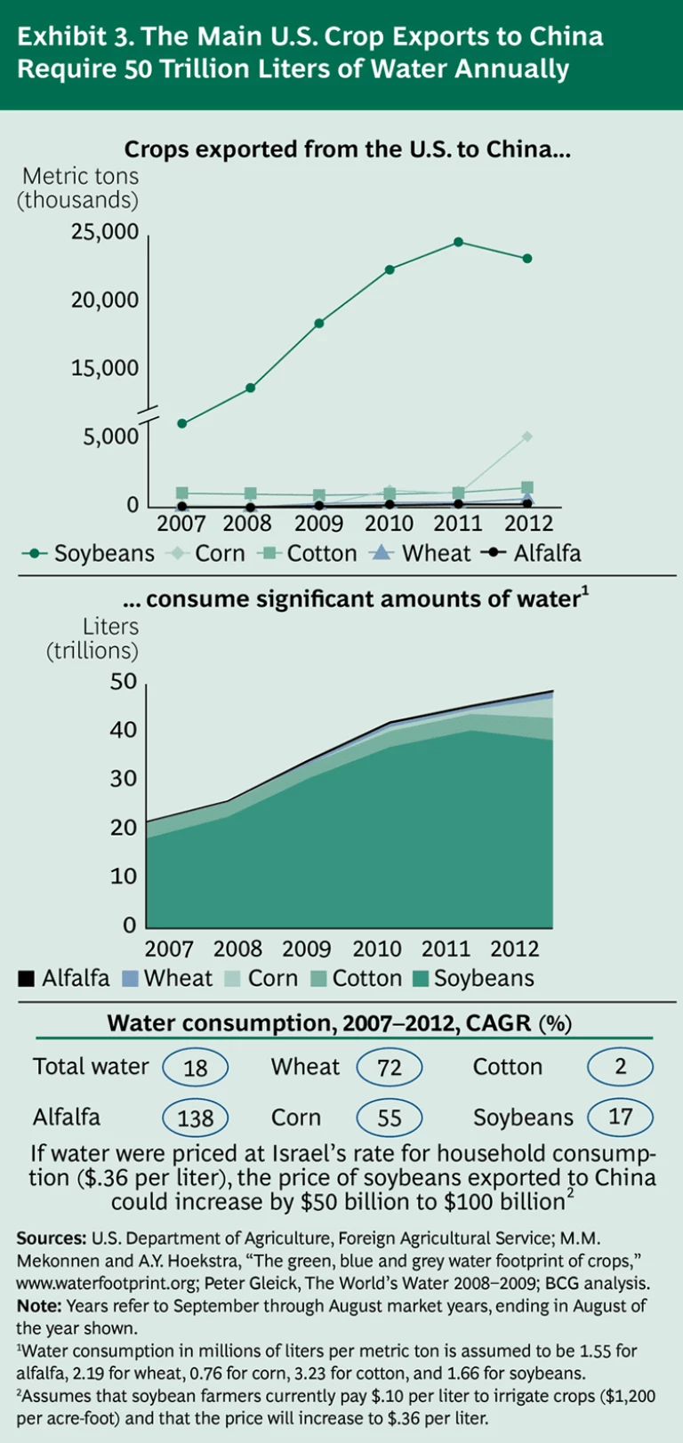 In the U.S., climate change is causing many once-fertile regions to become arid and difficult to irrigate. This, together with enormous exports to Asia of crops such as corn and soybeans, puts the U.S. itself at increasing risk of scarcity of both food and water. From 2007 through 2012, the amount of water required to produce the main export crops for China increased at an average annual rate of 18 percent to some 50 trillion liters of water. (See Exhibit 3.)