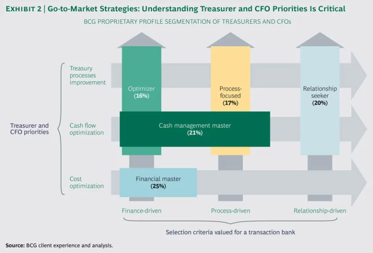 The final step in becoming a transaction-banking champion is to outperform competitors in go-to-market strategies. BCG has found that the winning combination involves fully understanding both overall client needs and the specific priorities of treasurers and CFOs. Client needs should be examined along four key dimensions: size, industry, region, and financial leverage. Treasurer and CFO needs can be categorized according to whether the priority is process improvement, cash flow optimization, or cost optimization; and within each of these categories, whether the motivation is finance-driven, process-driven, or relationship-driven. (See Exhibit 2.)