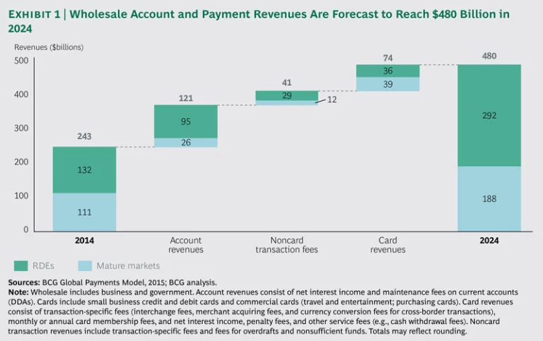 Wholesale transaction banking generated about $330 billion in revenues globally in 2014. Account and payment revenues (covered in this report) generated $243 billion and are expected to nearly double to about $480 billion by 2024, a CAGR of 7 percent. (See Exhibit 1.) Trade finance added $45 billion, and value-added services (such as information reporting) contributed another $40 billion. Trade finance revenues should reach nearly $100 billion by 2024, a CAGR of 8 percent. (See the sidebar “Being a Champion in Trade Finance.”) In general, growth will be driven by increasing volumes and deposit balances, as well as by improving spreads. The importance of all these drivers, however, will vary by region. In RDEs, account revenues stand out as a dominant growth driver.