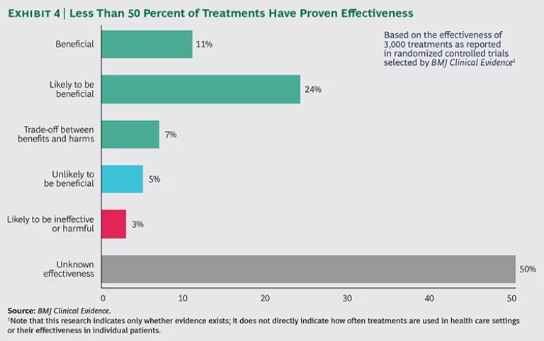 For many clinical interventions, the scientific evidence just doesn’t exist yet. Treatment guidelines may offer a menu of options and excellent advice on how to execute them—but little guidance on whether to do so. In a review of 3,000 interventions used to prevent and treat common clinical conditions, the journal BMJ Clinical Evidence found that more than 50 percent of these interventions were not supported by evidence of effectiveness.