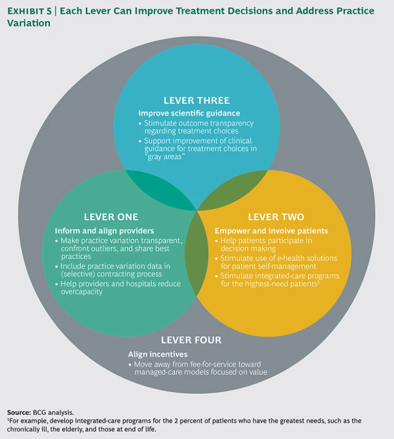 Health care payers, public and private, can shed light on unwarranted practice variation by analyzing and leveraging their huge and comprehensive data sets. This data can help create transparency of outcomes, inform providers on best practices, and guide contracting decisions. More generally, payers can use their unique position within the health care value chain to facilitate optimal treatment decisions and minimize perverse incentives that erode quality and value. We have identified four levers that can help reduce practice variation: inform and align providers, empower and involve patients, improve scientific guidance, and align incentives. (See Exhibit 5.) For each lever, we recommend several concrete actions that health payers can take.