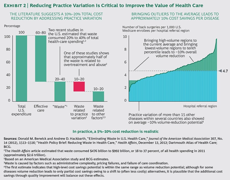 Our analysis indicates that a reduction in practice variation would lead to better outcomes, improved patient experience, and significantly lower health-care costs. Of the 20 to 40 percent of estimated “waste” in the health care system, practice variation accounts for approximately half. We also estimate that about half of that, or 5 to 10 percent of total costs, can be eliminated if payers systematically address practice variation. (See Exhibit 2.)
