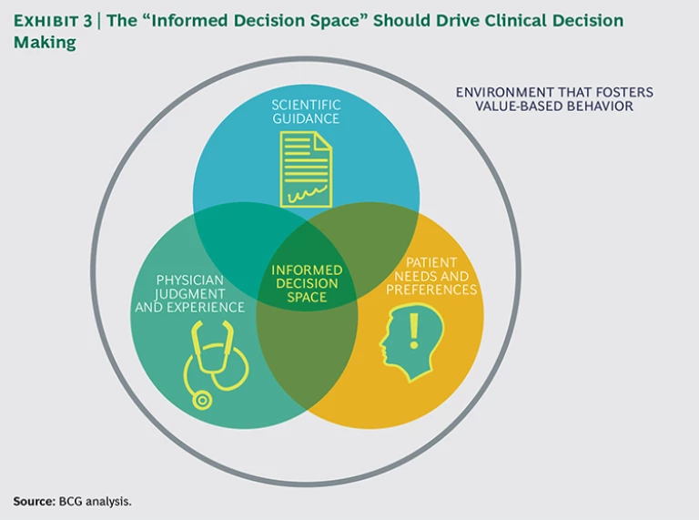Optimal treatment requires informed decision making, for which three factors must converge: clear scientific guidance, patient involvement, and physician judgment and experience. (See Exhibit 3.) When these three factors come together, physicians make more-informed treatment decisions for their patients, diminishing unwarranted practice variation. It also helps to have a system with financial incentives in place to reward high-value care rather than high-volume care, though this alone is not enough.