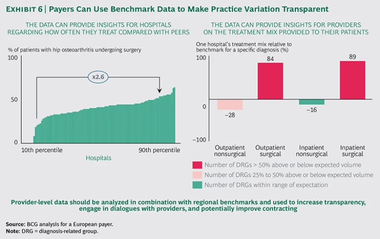 By systematically sharing benchmark data with clinicians who overtreat or undertreat relative to their peers, payers can engage in one-on-one dialogues or joint discussions with providers. (See Exhibit 6.) BCG has supported payers in data analysis and physician discussions; in the vast majority of cases, physicians had little to no prior insight into practice variation. They often did not know how they compared with other providers, and some were shocked by the data. As a result, physicians benefit enormously from comparative data and—when the positioning is right—very much appreciate the opportunity to see how they stack up in comparison with their peers. In a setting where physicians are working with limited data on patient outcomes and have no way to compare their performance with that of their peers, these conversations can provide unprecedented insights.
