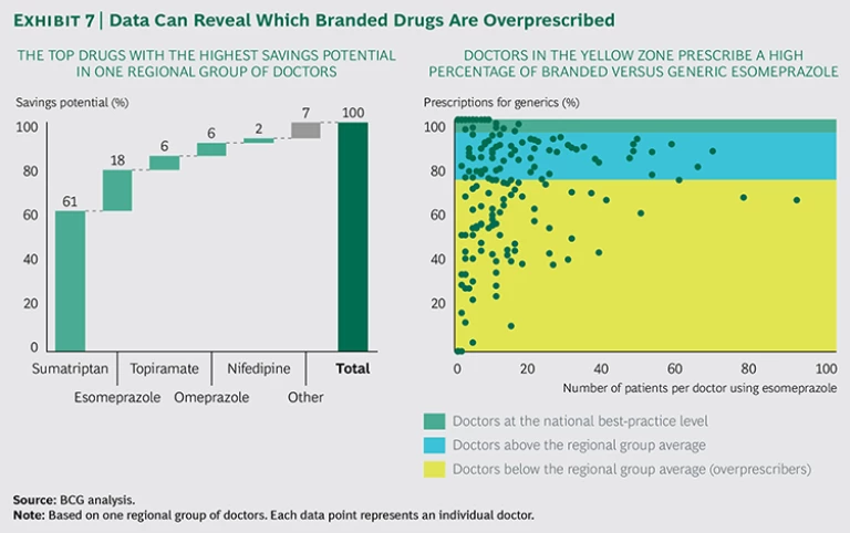 By shedding light on differences in prescription behavior among doctors, hospitals can realize significant savings while increasing the quality of care. Exhibit 7 illustrates how physicians vary in their prescription choices for branded versus generic drugs and the potential cost savings that would come from changing this behavior. By simply sharing this data, the payer achieved better financial results and higher awareness among doctors—without negatively affecting total patient care. In doing so, it improved the generic prescription rate for specific medications from 60 to 70 percent to more than 95 percent, leading to savings of more than €100 million in pharmaceutical costs.