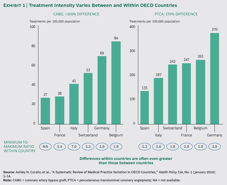 Models of health care delivery and financial incentives for providers vary greatly around the world, and this can affect the treatment decisions of physicians and patients. For example, a 2013 BCG study showed that traditional fee-for-service reimbursement models in the U.S. led physicians to favor invasive care over preventive care. (See Alternative Payer Models Show Improved Health-Care Value, BCG Focus, May 2013.) This stands in contrast to HMOs and capitation models, in which financial incentives are more aligned between payers and providers. However, while delivery models and financial incentives undoubtedly play a role in clinical decision making, enormous variations in treatment decisions remain, even within the same system.