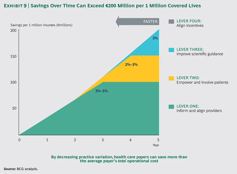 Although cost saving is just one of the benefits that will come from reducing practice variation (maximizing value to members is the ultimate goal), it provides a useful shorthand to illustrate the potential rewards for payers. We have seen that full implementation of the four levers can lead to savings of €100 million to €200 million per million covered lives over three to five years, or 5 to 10 percent of total health-care costs. Even for payers that implement just one or two of the levers, the impact can be very significant. Here is a breakdown of potential cost savings:
