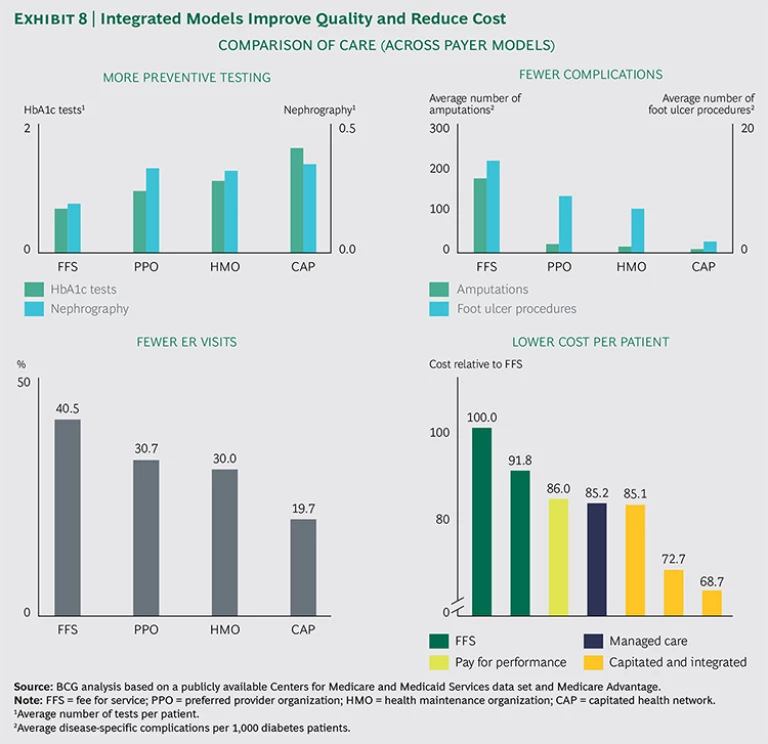 BCG analysis has shown that plans with higher alignment deliver higher-quality care than fee-for-service medicine, while significantly reducing costs. The impact can be very significant: proven higher quality and 15 to 30 percent lower costs. (See Exhibit 8.) We recognize that not all payers have the freedom to experiment with alternative reimbursement models, but payers should at least engage in discussions with regulators to create the room to experiment.