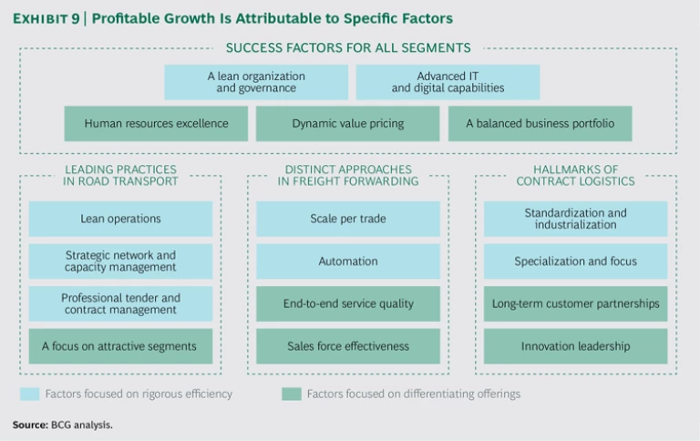 We first discuss these categories with regard to an overarching set of success factors for all industry segments. (See Exhibit 9.) Then, to illustrate what sets apart the leaders in specific T&L segments, we focus on the success factors in road transport (the largest segment in terms of market size), freight forwarding (two segments with relatively high ROA), and contract logistics (a segment with high CAGR).