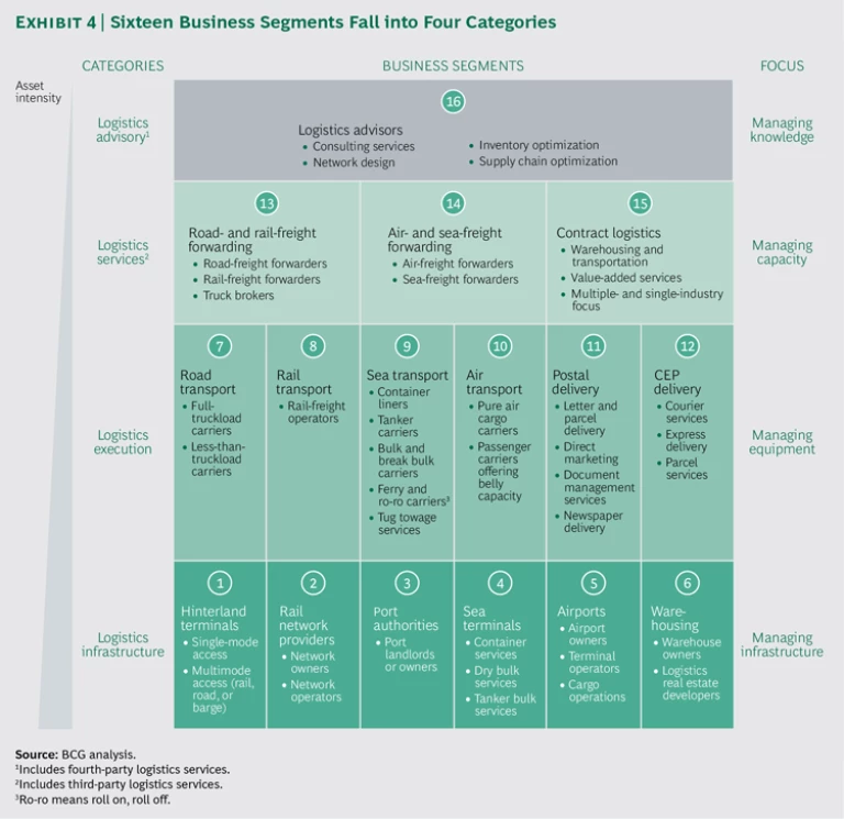 - Sixteen Segments Within Four Broad Categories. T&L businesses can be grouped into 16 segments on the basis of the service provided. These segments can in turn be grouped into four categories on the basis of asset intensity. (See Exhibit 4.)
