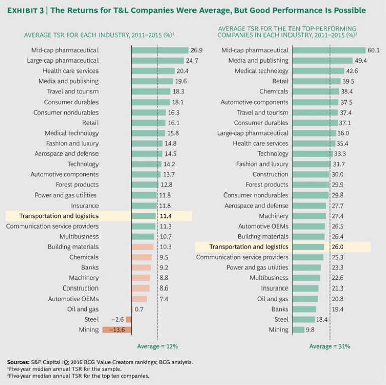 Not surprisingly given its low ROCE, the T&L industry also did not reward its shareholders with high returns compared with other industries. During the five-year period from 2011 through 2015, the