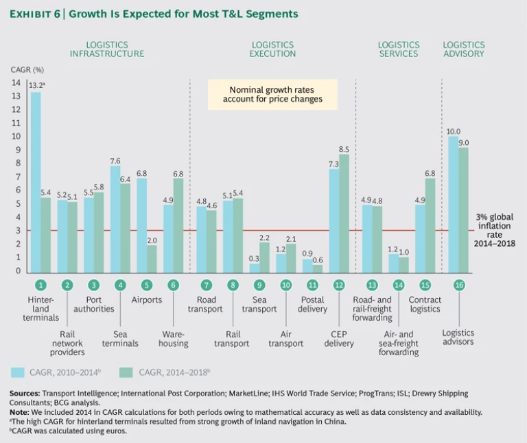 Diverging Growth Rates Among Segments. All industry segments grew from 2010 through 2014, and this growth is expected to continue from 2014 through 2018. (See Exhibit 6.) For most segments, the forecast nominal compound annual growth rate (CAGR), which is adjusted for price changes, is 4% to 7%. Macroeconomic conditions affecting the T&L industry are expected to promote a growth rate for many segments that exceeds the global inflation rate during this period.