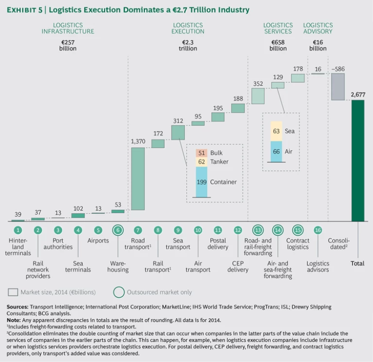 The €2.7 trillion T&L market is dominated by logistics execution, with combined revenues for its segments of €2.3 trillion. (See Exhibit 5.) Road transport is the largest segment, with revenues of €1.4 trillion. Sea transport is the second largest segment (€312 billion). This segment is dominated by container shipping (€199 billion), owing to the relative ease and efficiency of transporting freight by this standardized mode. Tanker shipping (€62 billion) and bulk shipping (€51 billion) represent much smaller shares of the segment.