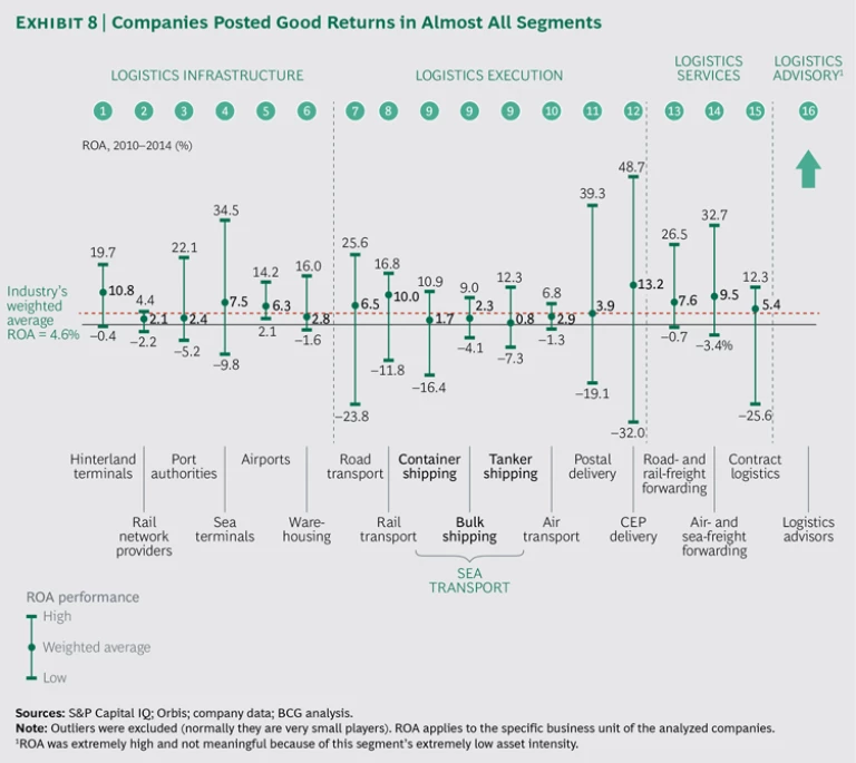 Despite clear differences in ROA performance at the segment level, a company-level analysis revealed that players throughout the industry had strong returns. (See Exhibit 8.) Of all the market segments, nine (hinterland terminals, sea terminals, airports, road transport, rail transport, CEP delivery, road- and rail-freight forwarding, air- and sea-freight forwarding, and contract logistics) had a weighted average ROA that exceeded the overall T&L industry’s weighted average ROA of 4.6%.