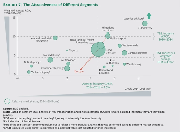 To gain a better understanding of segment attractiveness in terms of both growth and returns, we plotted each segment’s forecast CAGR from 2014 through 2018 and weighted average ROA from 2010 through 2014, as well as the range of the T&L industry’s WACC. Companies whose ROA was above the WACC at any point from 2010 through 2014 earned the cost of capital. (See Exhibit 7.)