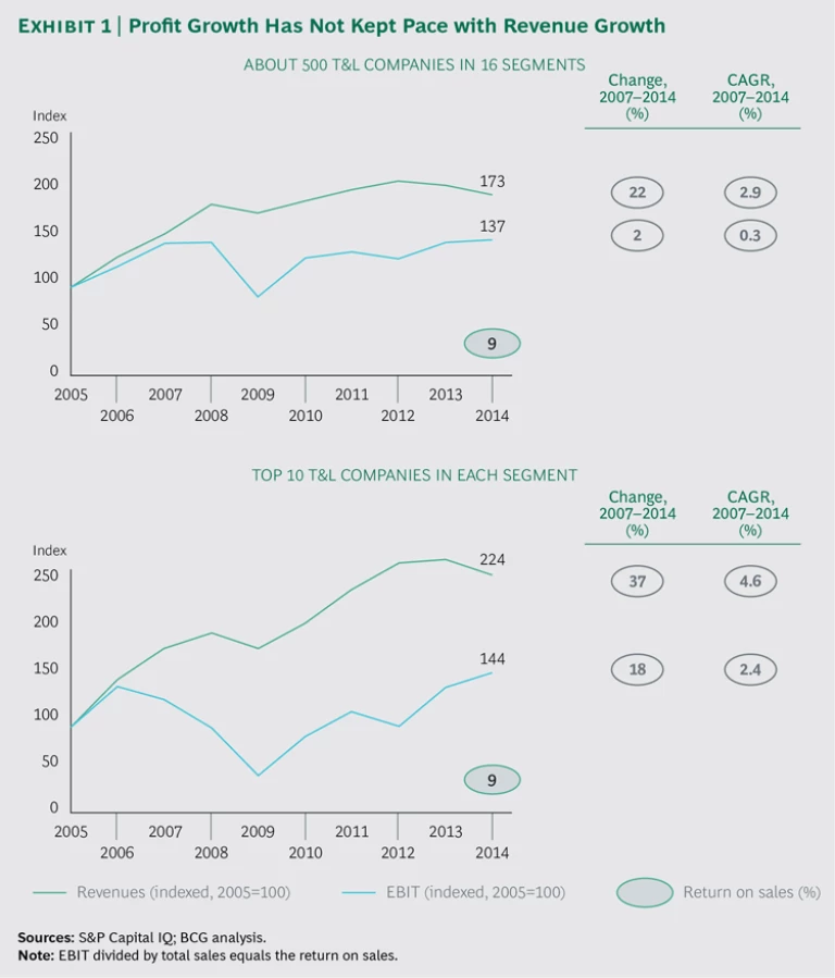 Are these good times or bad times for the transportation and logistics (T&L) industry? The industry has grown significantly since the turn of the millennium, and most segments emerged from the 2008 financial crisis with strong growth prospects. Despite sound revenue growth, however, only a few T&L companies have managed to enjoy higher profits.
