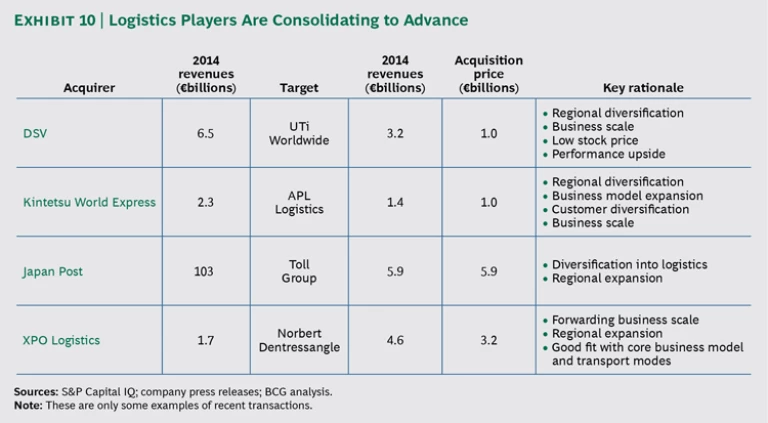 Freight-forwarding companies should consider options for achieving scale on select high-priority trades through organic and inorganic growth. A leading freight forwarder uses organic growth and an aggressive acquisition strategy to attain scale in attractive segments and quickly expand into rapidly growing markets. Indeed, there are several examples of logistics companies with strong freight-forwarding units and global aspirations that are using M&A to achieve scale and diversification in their freight-forwarding operations. (See Exhibit 10.)