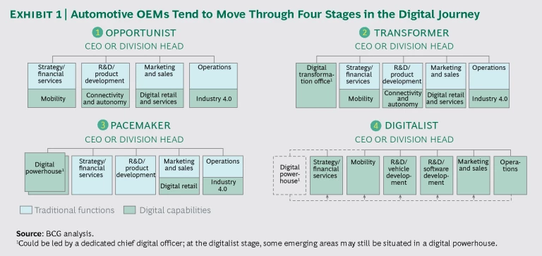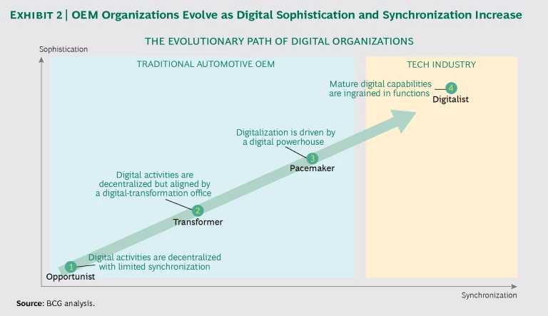 We see five topic areas at the intersection of the traditional automotive and the digitally enabled business that OEMs must be able to address: mobility, connectivity, autonomy, digital retail and services, and Industry 4.0. On the basis of our analysis of 20 automotive OEMs in North America, Europe, and Asia-Pacific, we also have identified four basic organizational archetypes, or stages, that major automakers adopt, generally in sequence, on their digital journeys: the opportunist, the transformer, the pacemaker, and the digitalist. (See Exhibit 1.)