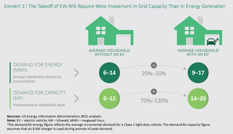 Stretch it by how much? Looking specifically at the residential sector, the addition of a charger that can recharge an EV in four to six hours would lead to an increase of 20% to 50% in megawatt hours of electricity consumed by the average household. When you consider that such increased consumption will be spread out throughout the day, however, the amount of increased energy generation capacity that would be required for the system as a whole (including commercial, industrial, and other sectors) is not massive. By contrast, charging that EV would require a much larger increase—70% to 130%—in grid capacity for the average household. (See Exhibit 2.) That increase in demand is roughly equivalent to the addition of an entire new home in the neighborhood. At the same time, the installation of public chargers, especially commercial rapid chargers, will put even more strain on the grid.
