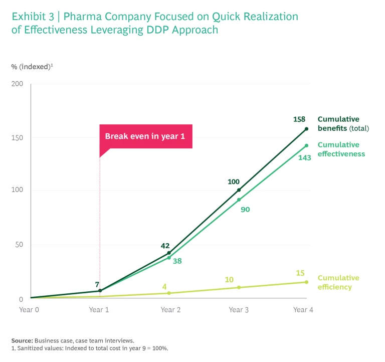 These advantages are not merely theoretical. We have helped companies across industries to prove the core concepts. For example, we worked with a pharma company that leveraged the DDP approach to execute a three-year plan to move to Industry 4.0 and digitize its operations starting in the first year. (See Exhibit 3.) The DDP approach enabled the company to modernize its factories outcome by outcome as opposed to waiting for a full ERP upgrade. Sales increased, production times decreased, defects and write-offs were reduced, and forecasting improved, as did overall inventory management. Within one year, the project was self-funding, and within two years, transformation benefits were 3.5 times the cost of investment, which allowed the company to make additional investments in its digital transformation and core capabilities.