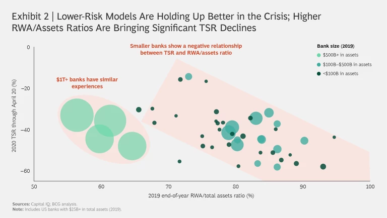Even with these forms of systemic support, however, some institutions may come under severe pressure as a result of exposure to certain sectors or because of general weakness in pre-crisis capital/liquidity levels. Some banks will no doubt emerge from this crisis stronger than others. As Exhibit 2 shows, year-to-date TSR versus the proportion of risk-weighted assets shows a clear negative correlation. Although there are other factors at play, it is clear that investors are discounting current earnings for banks with riskier asset books.