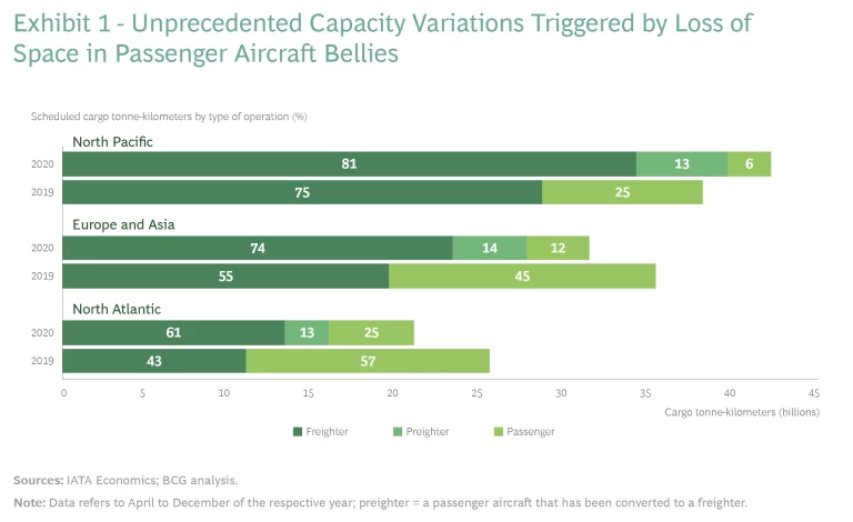 As passenger airlines furloughed workers, parked aircraft, and halted investment in non-core activities in March 2020, air freight became the unlikely center of industry attention. Since wide-body passenger flights typically reserve more than half of the available space in their lower holds (or “bellies”) for cargo, supply quickly became constrained. (See Exhibit 1.) Not coincidentally, search volume by freight forwarders on cargo.one, a digital distribution marketplace, saw a step-change increase of 42% in one week of early March 2020, and 2020 booking volume jumped to 700% of 2019 levels.
