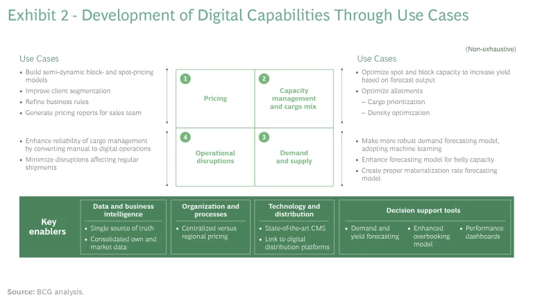 Another key step in the evolution of digital capabilities will be the development of a semi-dynamic block-commitment pricing model. Typically, this is a business-rule-based model that accounts for client segmentation and cargo categories and generates quotations to support sales analysts in negotiations based on historical and actual demand and flight performance. We call this a contract-quote generator.