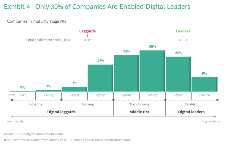 On the basis of this ranking, we split companies into three tiers in order to compare the top 30% of most-enabled companies (digital leaders) with the bottom 20% (digital laggards). These comparisons inform much of this report.