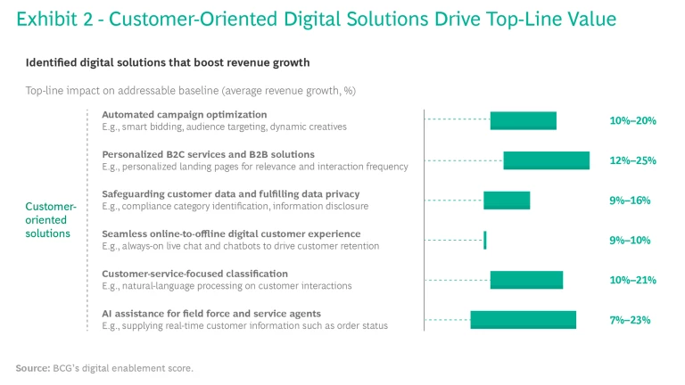 Digital leaders achieve the biggest impact from customer-oriented solutions (those related to improving customer experience, sales, and marketing). Common examples include automated campaign optimization, such as smart bidding and personalized B2C or B2B services (customized landing pages, for example). (See “Improving Customer-Oriented Solutions.”) Our research found that leaders scale more customer-oriented solutions than they do either operational or functional solutions.