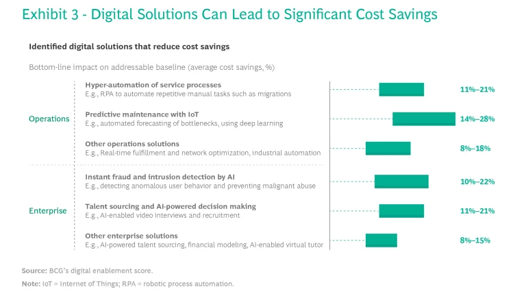 BCG’s latest research on digital proficiency and maturity, which covered approximately 2,000 global companies, found that scaling individual digital solutions can generate revenue increases of 9% to 25% and cost savings of 8% to 28% compared with the pertinent baseline. (See Exhibits 2 and 3.) But companies that scale several solutions can reach an enterprise-wide revenue increase of almost 17%, along with a 17% reduction in costs. Scaling also creates qualitative benefits, such as better reimagined customer experiences, a greater ability to integrate digital and data ecosystems, stronger business resilience, and a more inclusive and diverse workplace.