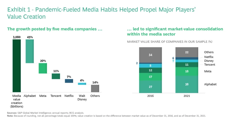 Our analysis of the media industry for BCG’s 2022 Value Creators rankings shows just how well the industry performed. From 2016 to 2021, the combined market value of the 63 media companies in our sample more than doubled, to $5 trillion. A significant portion (60%) of the increase in valuation came during the peak of the COVID-19 pandemic, the 21-month period from March 2020 to November 2021. Five media giants—Alphabet, Meta, Tencent, Walt Disney, and Netflix—accounted for more than 85% of the shareholder value that the industry added during that time.