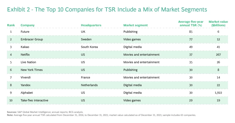 Half of the top 10 media companies for TSR performance are appearing on the list for the first time. One is Kakao, the South Korean digital media company that parlayed a popular messaging app into a digital media ecosystem. It continues to expand through mergers and acquisitions, and is now reorganizing operations to focus on metaverse market opportunities. The company’s five-year annual average TSR of 49% landed it in the number three spot in our ranking.