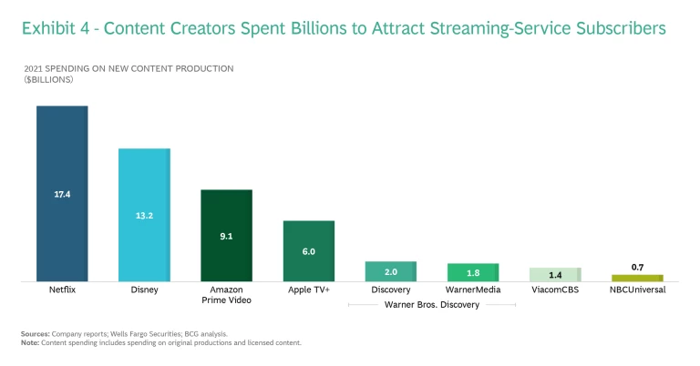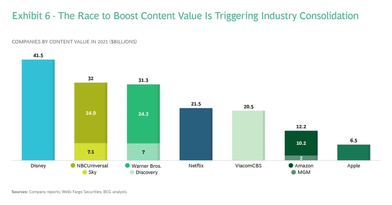 Spend on content. Consumers’ seemingly insatiable desire for new things to watch or interact with led media companies to invest billions in content development, with Netflix, Disney, Amazon, and Apple TV alone spending close to $46 billion last year. (See Exhibit 4.) According to BCG research, about 72% of consumers expect to spend at least as much time watching streaming content once the pandemic era is over as they did during the crisis. But attracting and retaining streaming-services customers could prove difficult. (See Exhibit 5.) Media platforms will likely need to continue spending on content and look for ways to diversify their offerings—ambitions that are triggering consolidation in the industry. (See Exhibit 6.) Investing in audio content such as podcasts is one area that shows promise for growth.