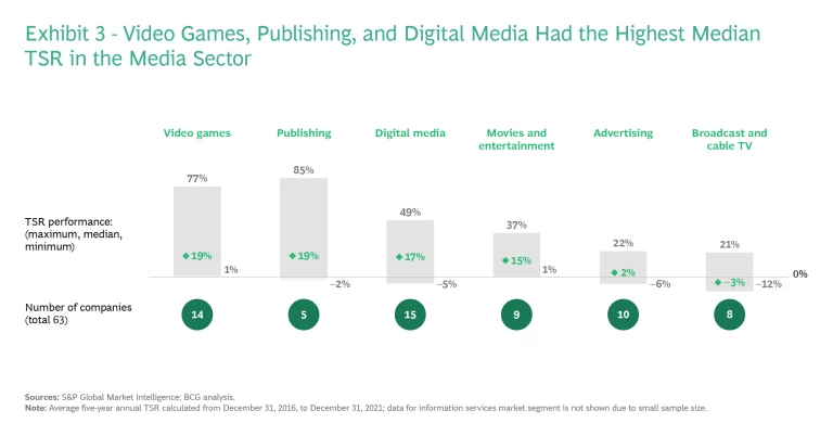 Big media players also outperformed the overall industry in total shareholder return (TSR). In our latest analysis, Alphabet, Meta, Tencent, Walt Disney, and Netflix had an annualized median TSR of 29%, compared with a median TSR of 14% for all of the media companies in our sample.