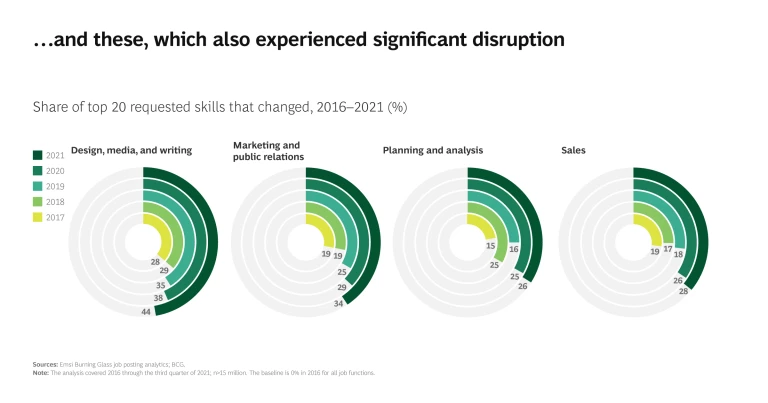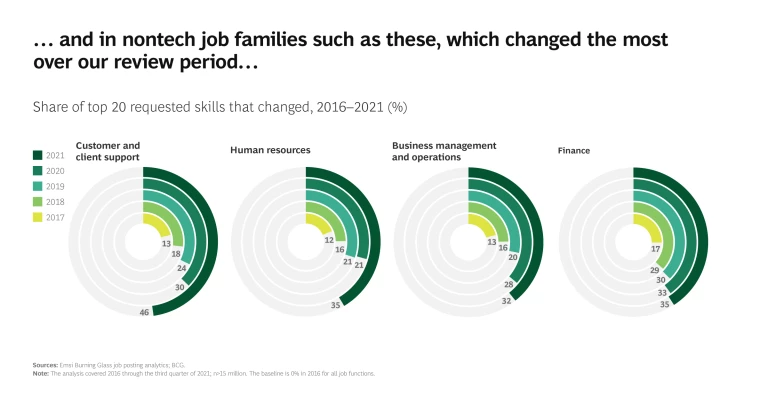 But even company leaders may not realize how profoundly and rapidly the jobs throughout their business and industry are evolving. A comprehensive look at job listings from 2016 through 2021 reveals significant changes in requested skills, with new skills appearing, some existing skills disappearing, and other existing skills shifting in importance.